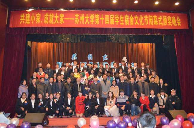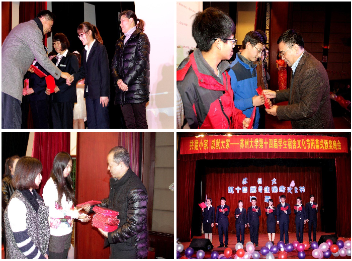 12月25日晚上的敬贤堂座无虚席,苏州大学第十四届学生宿舍文化节闭幕式暨颁奖晚会在这里隆重举行。校党委副书记、副校长江作军、副校长杨一心,党委宣传部常务副部长孙宁华、学生处处长陈晓强、校团委副书记徐美华、研究生院党委工作部部长宁正法、继续教育处处长缪世林、国际合作交流处副处长袁晶、保卫处处长霍跃进、后勤处处长李翔、后勤处党委书记黄志斌、后勤处副处长兼学生宿舍管理办公室主任顾明高、信息化建设与管理中心副主任黄平、苏州电信姑苏区负责人吴惠民、东吴物业公司总经理陈爱萍、华泰物业公司总经理赵逸萍等领导和嘉宾出席。