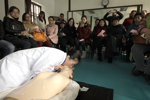 校医院杨晓卿医生为大家细致地讲述判断病人有无意识、呼救、保持气道通畅清理异物、判断呼吸、通气、胸外按压等基础生命支持的抢救流程。心肺复苏简称CPR,当发生心血管疾病或其他意外病变引起呼吸心搏骤停时,采取以人工呼吸代替患者自主呼吸、以心脏按压方式形成暂时人工循环并诱发心脏的自主搏动。杨医生在现场模拟了CPR整个流程后,现场七八位老师进行了演练。