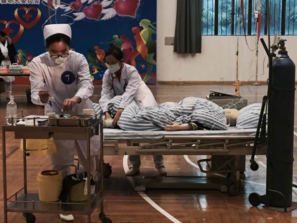 本次大赛根据总分决定排名,分心肺复苏和过敏性休克模拟病例的诊断急救两项内容。校医院领导亲自带队参加比赛,经过激烈的角逐,我校医护代表队参赛队员杨晓卿、蒋超超以扎实的知识、娴熟的技能为我校赢得了二等奖。