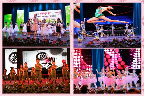 伴随着曼妙的光影效果,朵朵鲜花在舞台上绽放。幼儿园特色鲜明的趣味形体操表演《春晓》,一上场就牢牢吸引了大家的眼球,体操队大孩子们标准的动作、默契的配合,赢得了惊雷般的掌声。幼儿园最小的孩子出演了亲子童话剧《绿色家园》,一个个可爱的小动物是我们的萌宝,爸爸妈妈们则化身森林、风雨恶魔、伐木工人,共同演绎着一个意味深长的故事,保护森林爱护环境是我们每一个人的责任。小班家庭亲子时装秀《快乐宝贝》和我们一起走进童话世界:小红帽与大灰狼、孙悟空与观音娘娘、白雪公主与坏皇后、葫芦娃、海绵宝宝、蜘蛛侠、爱莎公主…一个个都是孩子们熟悉喜爱的动画人物。大班舞蹈串烧《大中国》展示了花木兰的飒爽英姿,中华武术的博大精深,解放军保家卫国的赤子之心,孩子们出色的表演,展示了他们从小都有作为一个中国人的骄傲与自豪。其他年级孩子们还表演了风格迥异的舞蹈:《大眼睛》、《我是一个好小孩》、《大小姐》、《我爱洗澡》、《快乐小企鹅》、《快乐的小青蛙》,动感活泼的节奏,把整个舞台气氛推向高潮,让在场的每个人沉浸在欢乐的歌声里、快乐的海洋中,共享金色童年。
