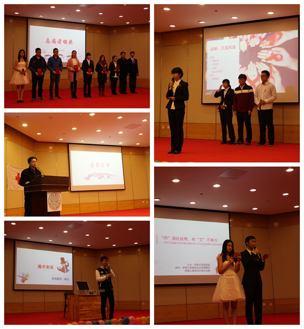 同日晚上,校医院、政治与公共管理学院联合苏州市工业园区疾病预防控制中心在独墅湖校区炳麟图书馆学术报告厅举办了以“‘同’扬红丝带,有‘艾’不单行”为主题的世界艾滋病日宣传晚会暨苏州大学社会组织防艾宣传项目总结大会。晚会节目新颖多样、内容丰富,参与表演的同学将防艾宣传活动主题巧妙地融合在音乐、魔术、情景剧中。创意新奇,寓教于乐,师生们在一阵阵笑声中了解并学习了解防艾知识。