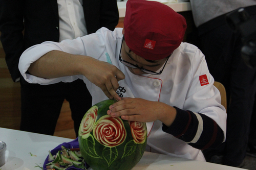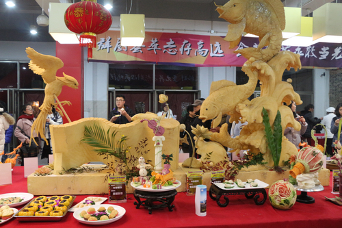 在展示区,一道道用萝卜、南瓜、西瓜等蔬菜和水果精雕细琢的菜品吸引了不少人驻足拍照、鉴赏。“松鼠小鲑鱼”、“虾篓小趣”、“江南风光”等名菜展现出了厨师们出色的手艺。苏州多家知名餐饮企业得月楼、新梅华、苏城家宴、朱鸿兴等名厨大师在传承苏帮美食精湛技艺的同时,奉上压箱绝活,悉心讲授制作过程,为师生们答疑解惑,也为校园厨师上了堂精彩的名师示范课。