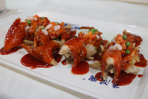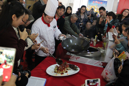 苏州知名餐饮企业、餐饮老字号得月楼的烹饪大师陈军师傅带来了自己的拿手绝活苏帮传统名菜“松鼠鳜鱼”,只见他熟练地把鱼身一压,依次把鱼身、鱼头、鱼尾放入油锅炸至呈金黄色捞出摆盘,接着将炒热的糖醋酱汁浇满桂鱼全身,一道热腾腾的“松鼠鳜鱼”就出炉了。不到五分钟,这道名菜就被围观的同学们抢吃一空。有机会品尝到的同学们都纷纷表示“味道好极了”!