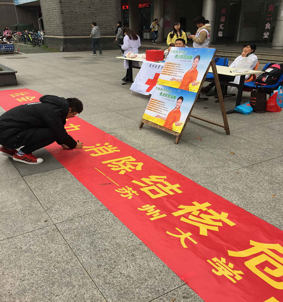 2017年3月24日是第22个“世界防治结核病日”,为进一步宣传普及结核病防治知识,动员全校师生共同关注和参与结核病防治工作,校医院联合学生工作处、校团委、机电工程学院学生会、医学部红十字会、东吴商学院青年志愿者协会、苏州市相城区疾病预防控制中心开展了主题为“社会共同努力,消除结核危害”结核病防治知识系列宣传活动,校团委、校医院利用微信等公众平台推送了结核病防控知识。师生们通过主题班会等形式组织学习,了解防控知识。结核病防治知识的进院、进班,在全校掀起了结核病防控知识的学习热潮。