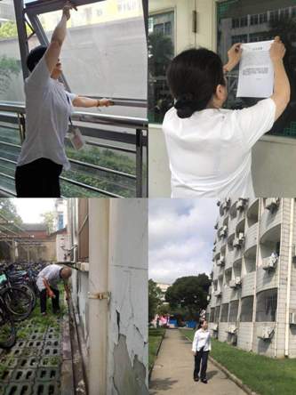 台风过后,后勤人及时清扫道路上被台风刮落下来的树枝、树叶等各种杂物,清扫仍然滞留在楼宇内的积水让地面尽快干起来,及时处理暴雨后相关楼宇的漏雨和损坏问题。同时进一步加强巡查,发现在暴雨中未能及时发现的漏雨、门窗损坏、栏杆倾塌等情况,并及时予以修复。从而让校园恢复正常的运行秩序。
