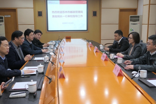 11月12日下午,苏州市邮政管理局党委书记、局长黄俊一行4人来学校检查指导校园快递工作,校总会计师周高、后勤管理处处长王云杰、副处长朱剑峰等陪同。