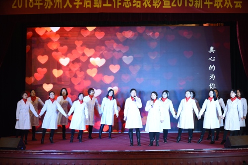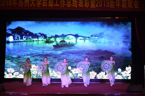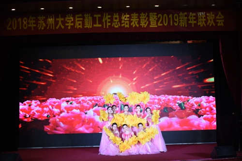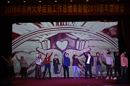 幼儿园老师们优美的舞蹈《走进新时代》拉开了新年联欢会的帷幕。改革开放四十年来的歌曲串烧、校医院小组唱《让世界充满爱》、青年职工舞蹈《燃烧吧,青春》纷纷展现了后勤人热爱生活、不忘初心、爱岗敬业、团结奋进的形象,苏大教服集团、东吴物业、华泰物业和科桥物业带来了舞蹈《茉莉花开》、小品《警报声》、护卫表演《擒拿术》和京剧《自己的队伍来到面前》等节目,生动展现了后勤人的工作情景和丰富的业余文化生活;王云杰、仇玉山、顾建忠、朱旻给大家带来风趣三句半《夸夸后勤》把整场联欢会推向高潮,掌声迭起,笑语不断;男女声二重唱《共筑中国梦》高水准的演唱娓娓讲述了昂首再启程共筑中国梦的决心。联欢会在全场合唱《歌唱祖国》中结束。回首2018,后勤人不忘初心、牢记使命,一路奔跑。展望2019,后勤人都将带着温暖携手前行。