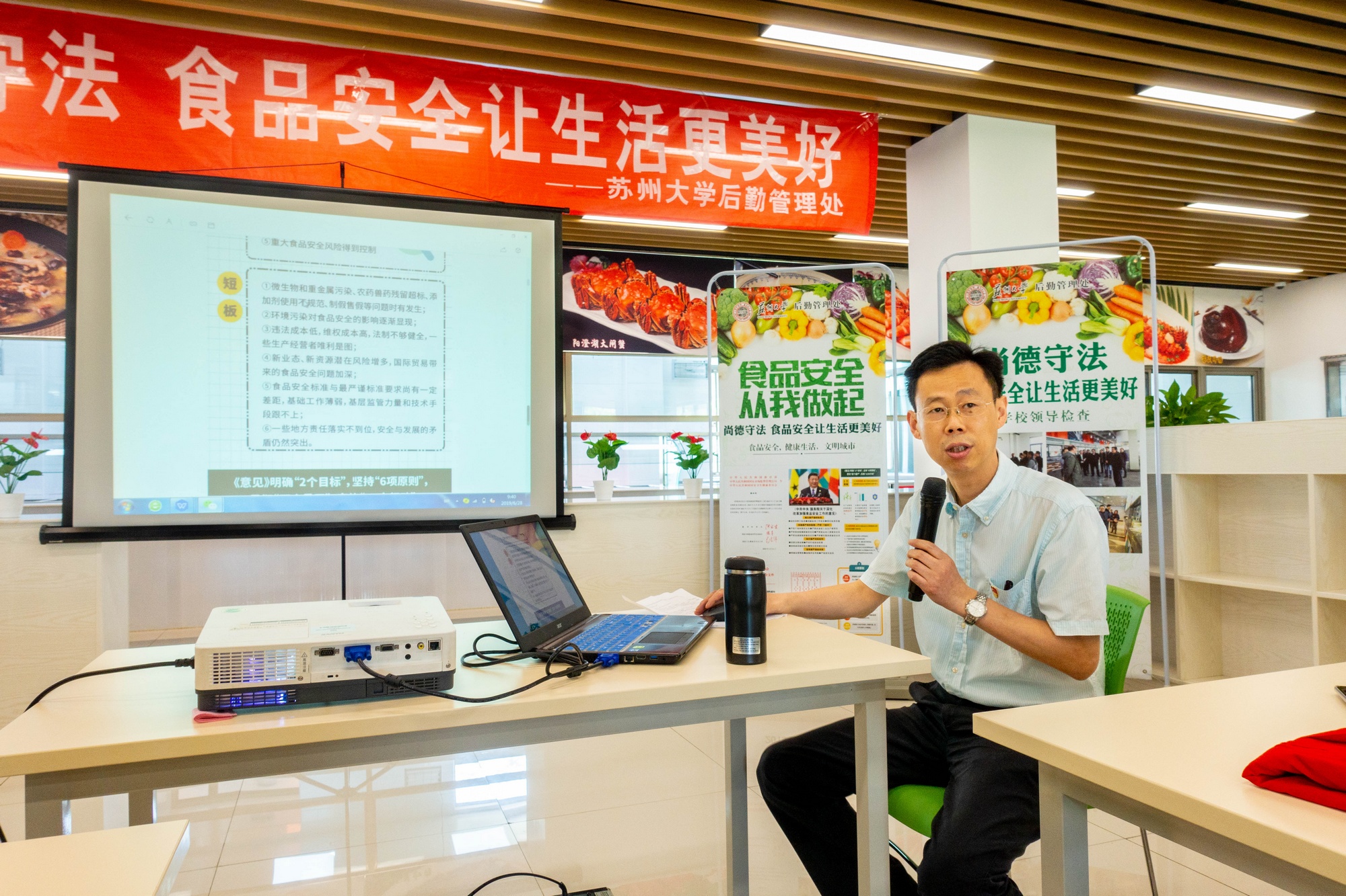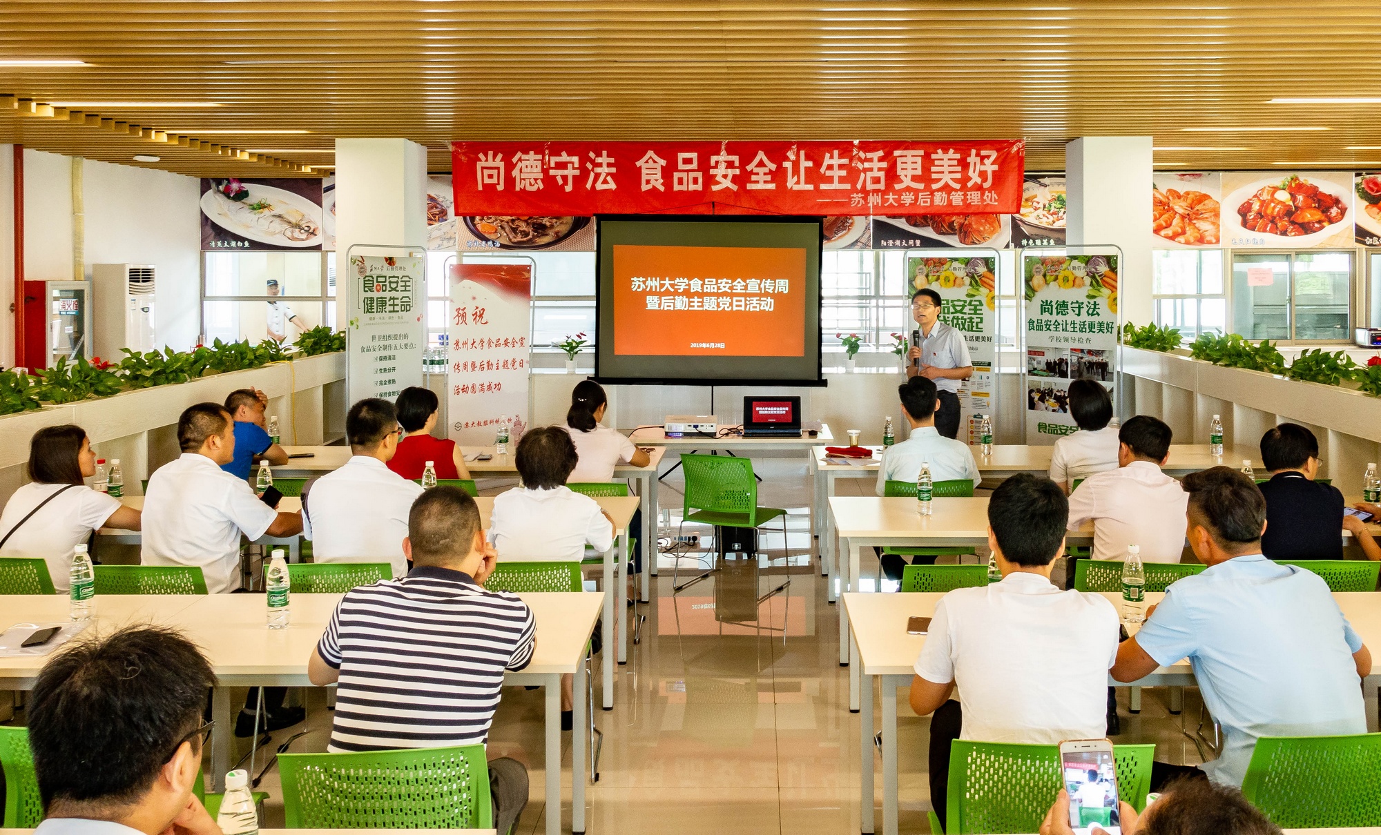 上午9:30,党支部书记朱剑峰宣传解读了《中共中央国务院关于深化改革加强食品安全工作的意见》等食品安全政策法规。他要求,科室管理员、食堂主任和食堂从业人员都要认真落实习近平总书记提出的“四个最严”要求,将食品安全宣传周活动作为食品安全工作新的起点,不忘初心、牢记使命,不断加大工作力度,守护苏大师生“舌尖上的安全”。他还强调,要强监管、守底线、防风险、保安全,加强制度建设,构建保障校园食品安全的长效机制。